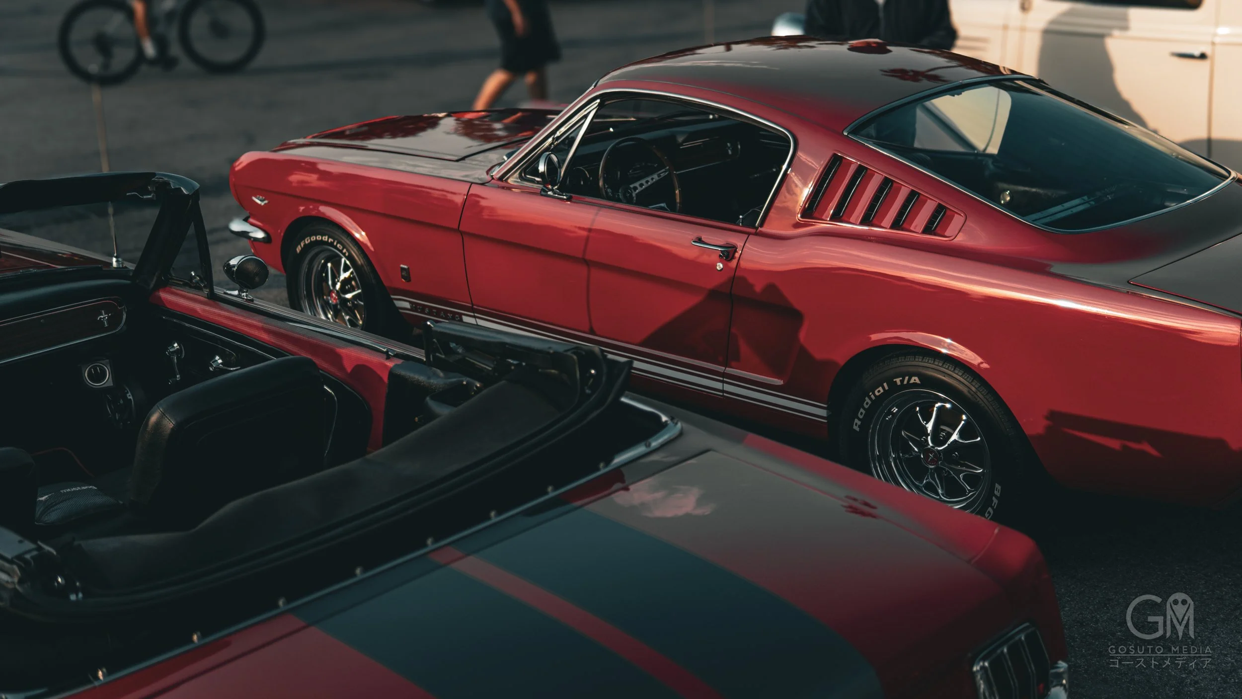 Red classic Ford Mustang with black accents parked outdoors, with a similar vintage motorcycle or bicycle in the background and reflections of the sunlight on the car's surface.