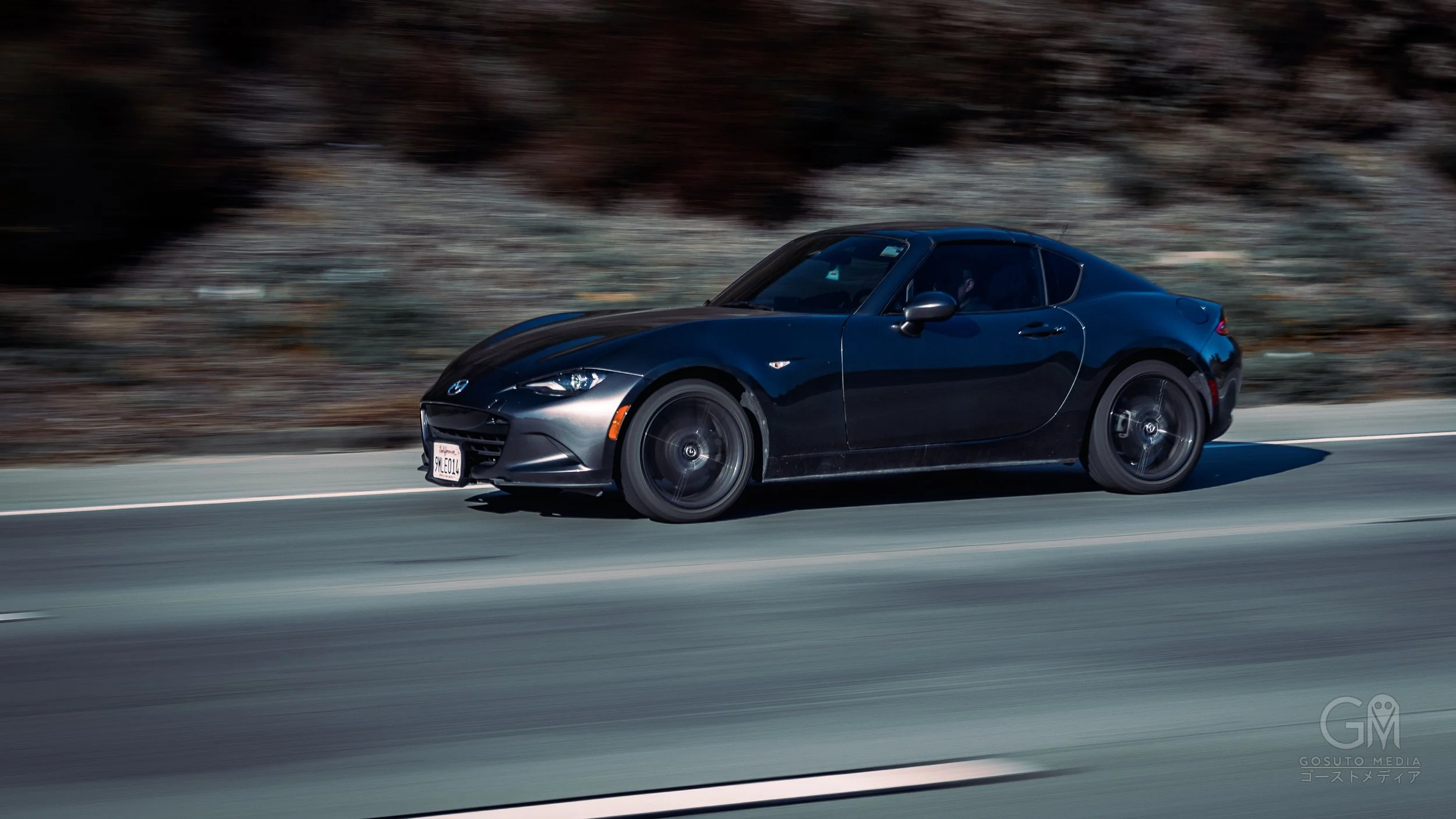 A grey Mazda Miata sports car driving on a highway with a motion blur background.