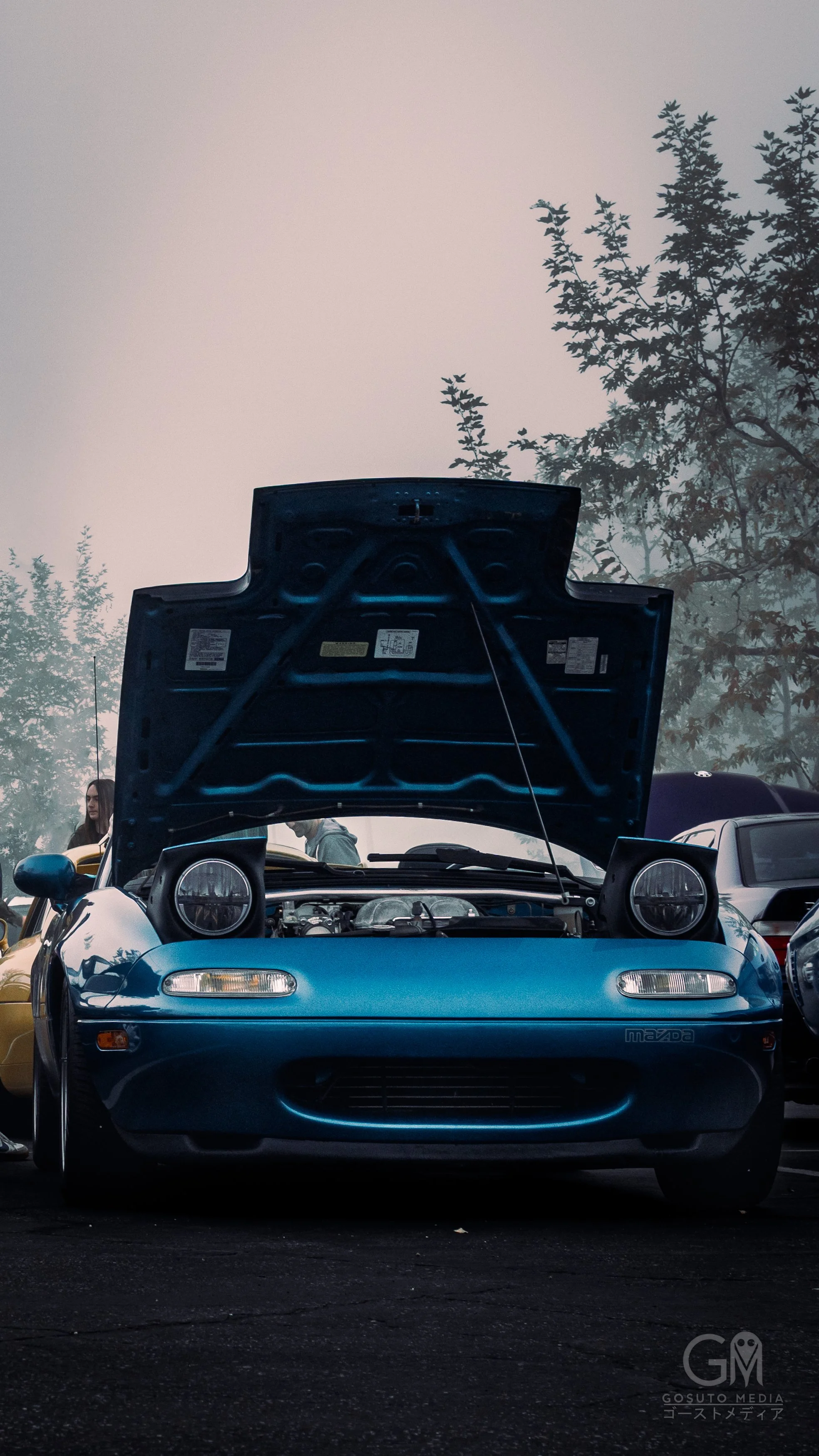 A blue Mazda sports car with its hood open at a car meet, with a few people and trees in the background.