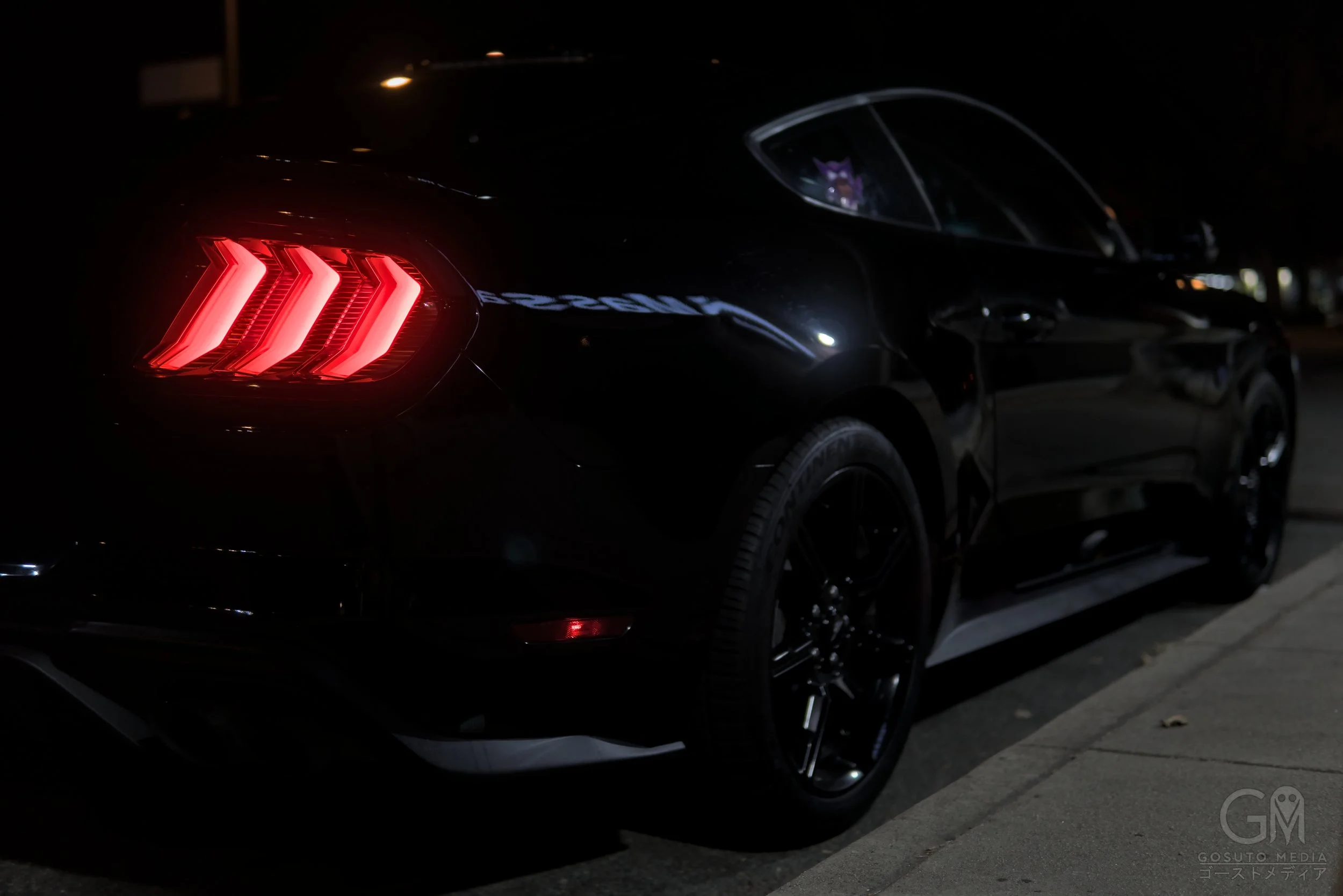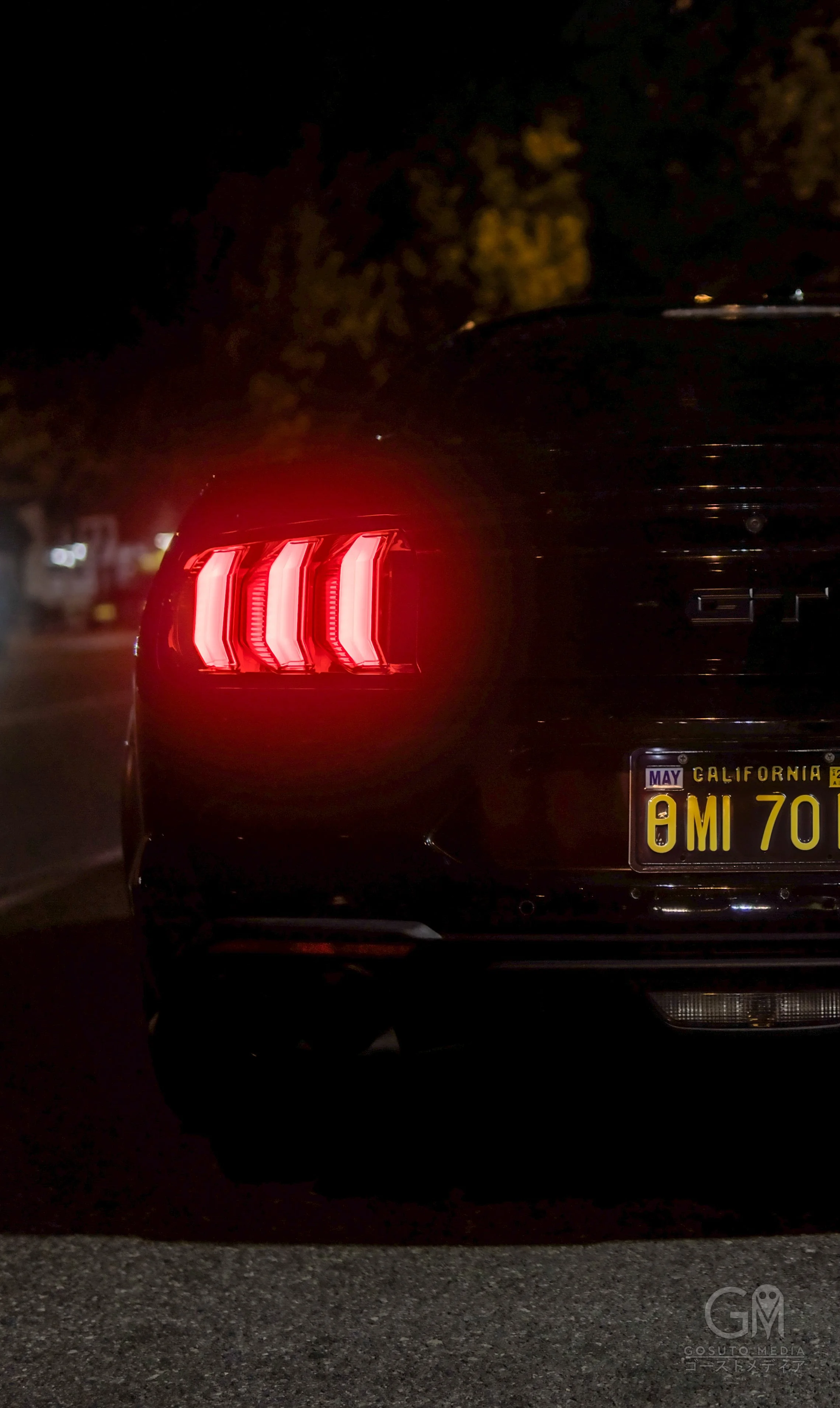 A black Ford Mustang showing its rear lights at night, with visible California license plate '8MI 70' and a few in the background.