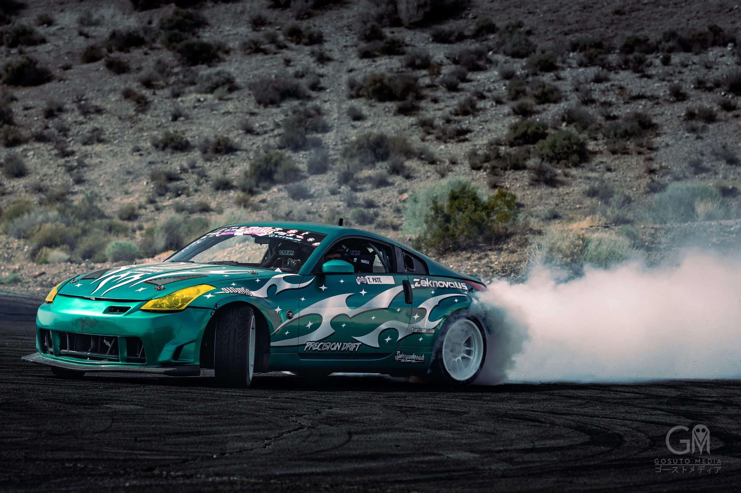 A teal Nissan Z with yellow headlights drifting on a dark asphalt road, creating a cloud of tire smoke with desert bushes and hills in the background.