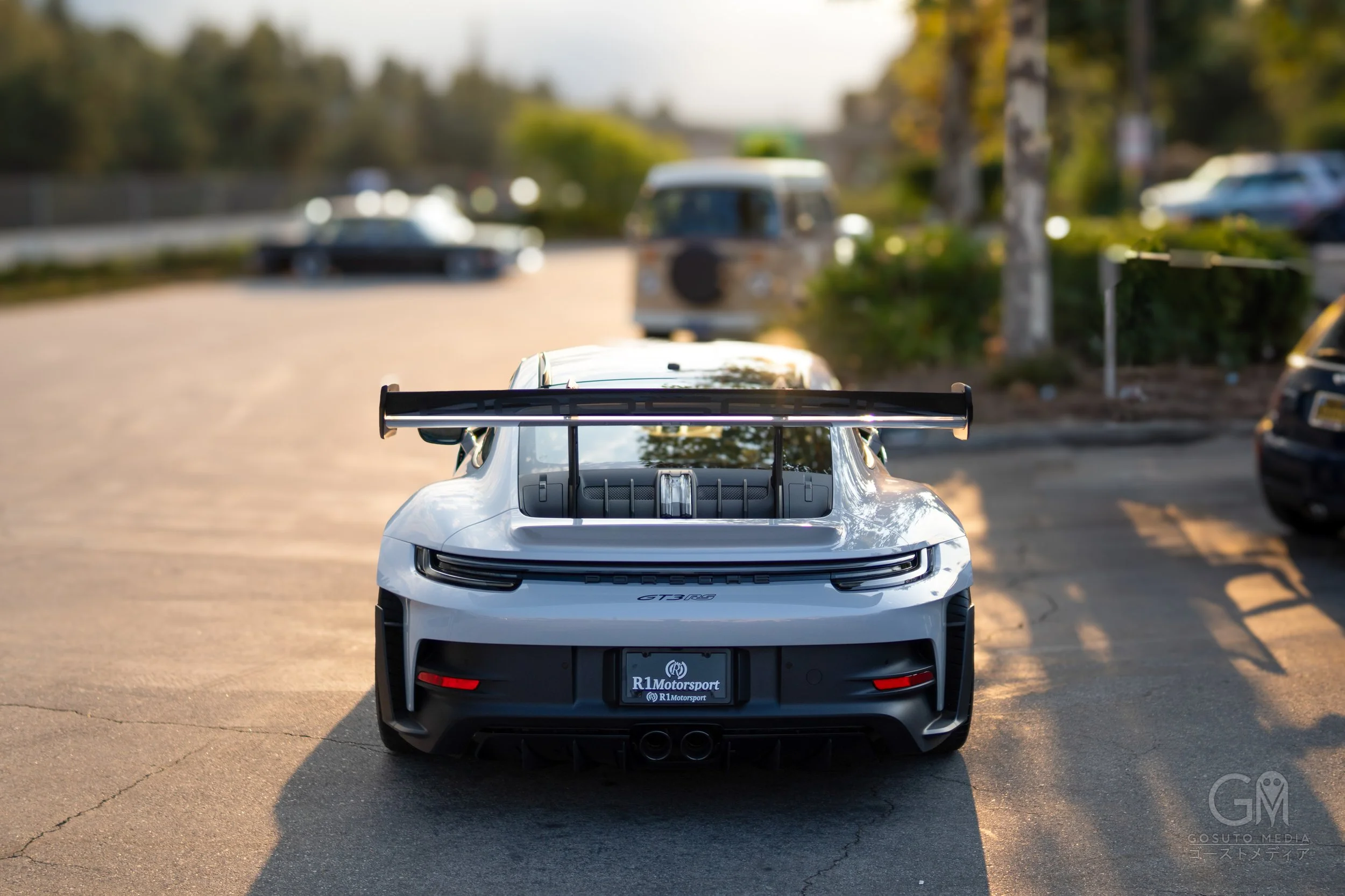 White Porsche 911 GT3 RS parked in a lot with a large rear wing and black accents, surrounded by other cars and trees, during sunrise.