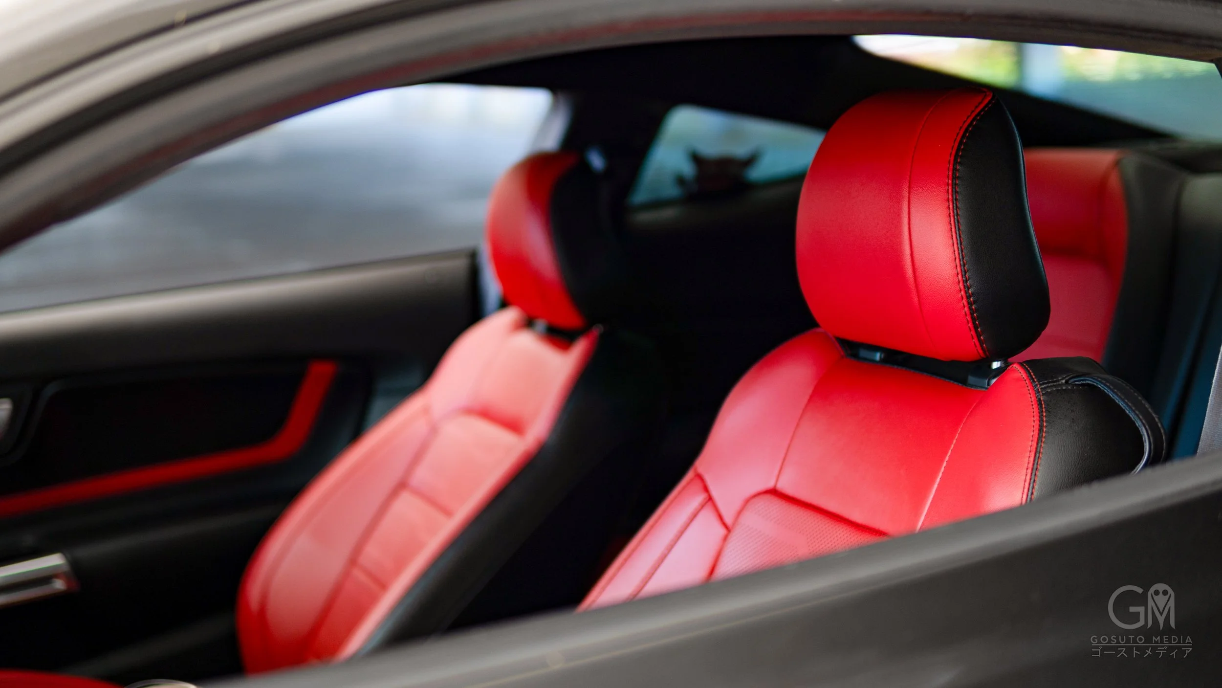 Interior of a vintage Ford Mustang car, featuring a wooden steering wheel, classic gauges, and black leather seats.
